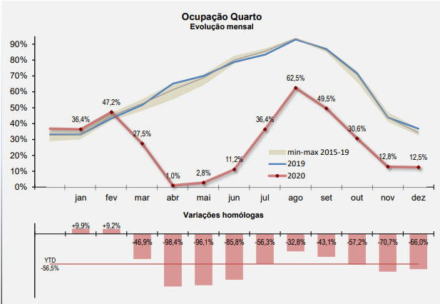 No que concerne à taxa de ocupação global média/cama ela foi de 10,5%, 19,1pp abaixo da verificada em Dezembro de 2019 (-64,4%), sendo que a taxa de ocupação registou o valor mais baixo de sempre para o mês de Dezembro.